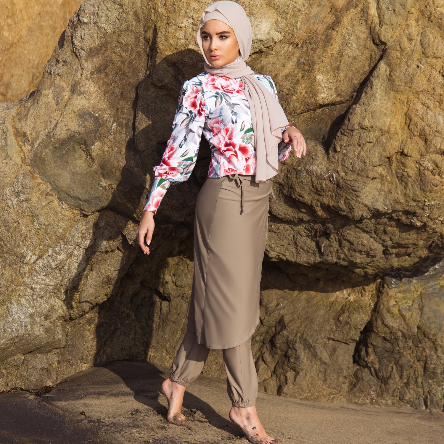 The very first of its kind, the Jamilah swimsuit combines a lavish oversized top with a stylish swim sarong. The innovative skirt comes attached to swim pants, allowing you to enjoy the water without compromising your modesty.